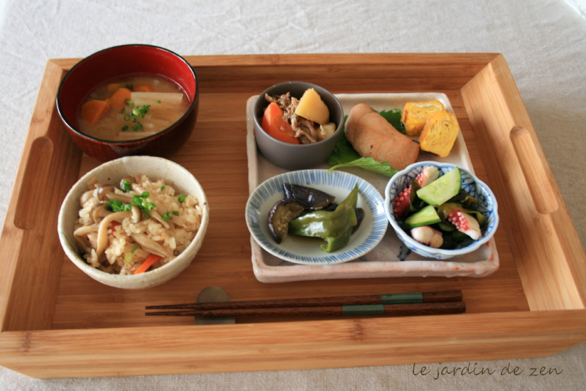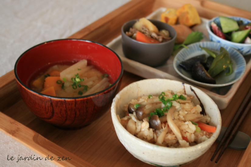 手前は炊き込みご飯とみそ汁。