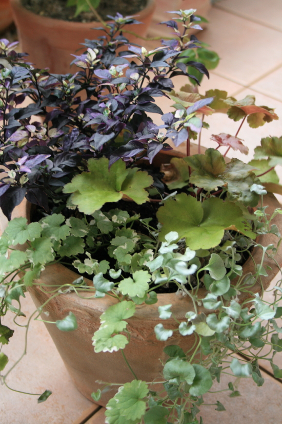 ヒューケラ、紫トウガラシ、グレコマの寄せ植え。