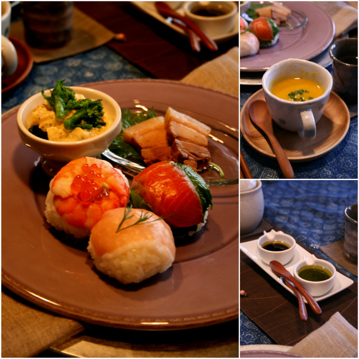 ●かぼちゃのクリームスープ(右上)には香りづけに